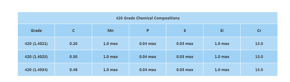 420不銹鋼是一種非常常見的不銹鋼牌號,該牌號是世界上最受歡迎的馬氏體牌號之一。有許多不同的 420 等級版本,但最受歡迎的 3 個版本是 420A、420B 和 420D。420A級根據(jù)EN規(guī)范寫為1.4021或X20Cr13,根據(jù)UNS規(guī)范寫為UNS S42000。此版本包含 ~%0.20 碳,此版本在熱威脅后可以得到高達 48-50 HRC 的硬度。